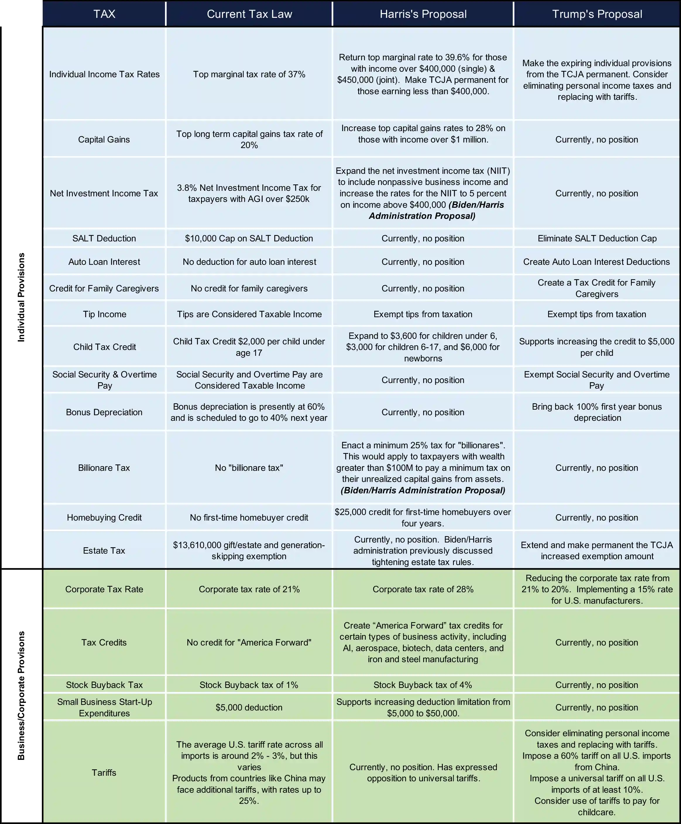 Tax policy has remained a continued focus for both Vice President Harris and former President Trump as we near the election and the conclusion of their campaigns. Changes to tax policy can have far-reaching implications for individuals, families, and businesses. We have prepared a comprehensive chart below that outlines current tax law alongside proposed tax plans from Vice President Harris and former President Trump. This chart was compiled using information from each candidate’s publicly available tax policies as well as provisions they have each discussed on the campaign trail. Also indicated on the chart are provisions proposed by the Biden/Harris Administration and not explicitly by the Harris campaign.