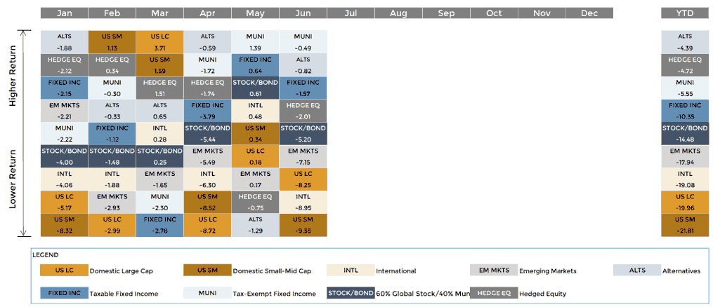 In a continuation of the first quarter, stocks and bonds struggled to find any sort of traction in the second quarter, leading to one of the roughest six-month starts to a calendar year on record. As stewards of client capital, we understand how difficult and challenging these last six months have been and we continue to work to ensure portfolios are properly positioned for successful outcomes over the long term. Markets have gone through numerous ups and downs over the course of centuries. No matter how often an investor goes through the bad times, it never feels especially comfortable. There is no easy path to wealth creation or preservation, and we should all recognize that volatility is a byproduct of the human impact on markets.