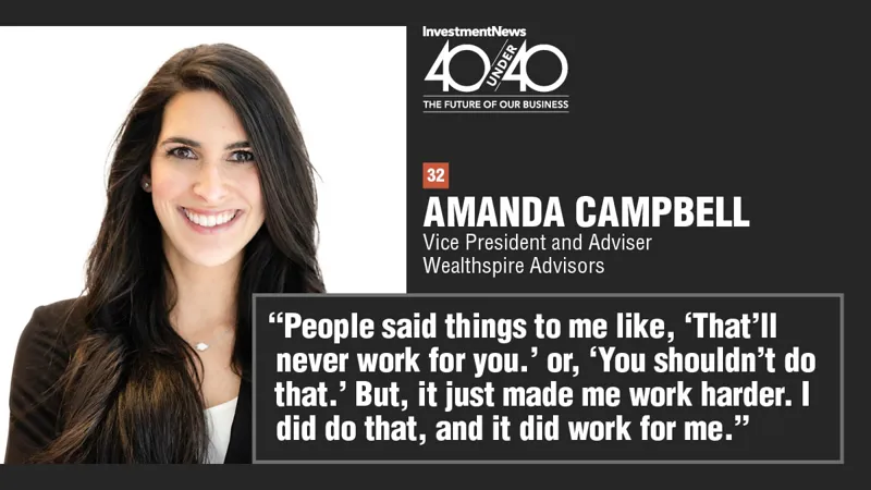 New York, June 7, 2021 – Wealthspire Advisors, an NFP company and independent investment advisor headquartered in New York, today announced that advisor Amanda Campbell CFP®, CDFA®, AAMS®, AIF® has been named to the 2021 InvestmentNews 40 Under 40 list, which celebrates up-and-comers in the financial advice industry.
